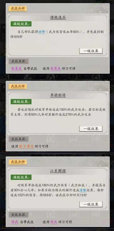 最适合孙尚香的A级技能当属借粮退兵,洞察可以免疫控制,劝降吸血可以保持状态,而且两层增益效果可以增强自带技能【江东枭姬】的伤害量;【单骑斩将】便于爆头,这便是孙尚香爆头弓或者爆头骑的核心所在。有的人说没有【单骑斩将】其次较好的选择是【江东解烦】,这也是个A级技能,50%会心效果,弓兵专属,有着很高的技能发动率,打骑兵特别好打,有着长达6秒的溃散效果,基本上面对骑兵一到二发【江东解烦】就可以锁定胜局,这个技能推荐在S1相对比较好用,尽管如此面对张郃盾以及蜀智等队伍还是略显乏力,发挥好的情况也是有机会取胜的。面对【天妒鬼才】和【虚实莫测】这样的技能真的是很难有发挥空间,因此三孙比较适合大多数低氪玩家,开地以及收获部分战功是没有问题的。