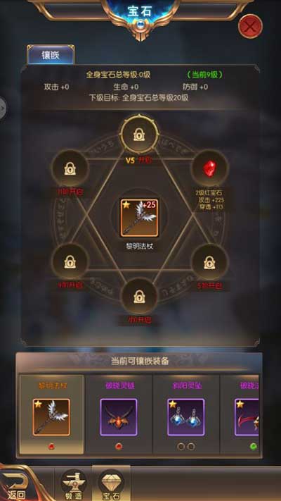 【宝石镶嵌】:得到宝石之后,可以将宝石镶嵌到有镶嵌孔的装备上。镶嵌之后,宝石的属性可以叠加到装备的属性之上。