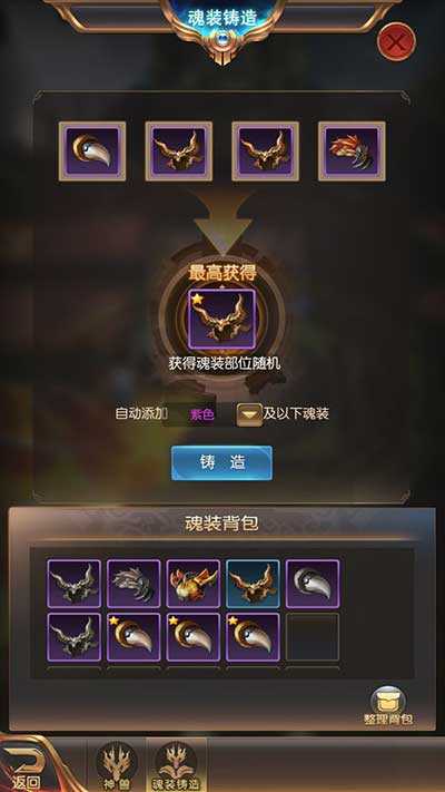 除了击杀 boss掉落魂装外,还可以通过魂装铸造来合成高级的魂装,合成规则为四件同等级即同为紫装或橙装可以合成下一级高级魂装。