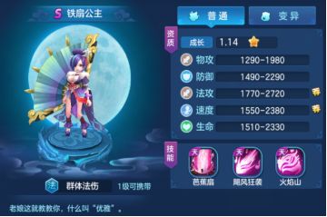 铁扇公主:红孩儿的母亲,高爆发群体法术伤害,但是需要储力一回合,而且攻击时会提高暴击,所以培养的好铁扇公主也可以是主力输出哦!