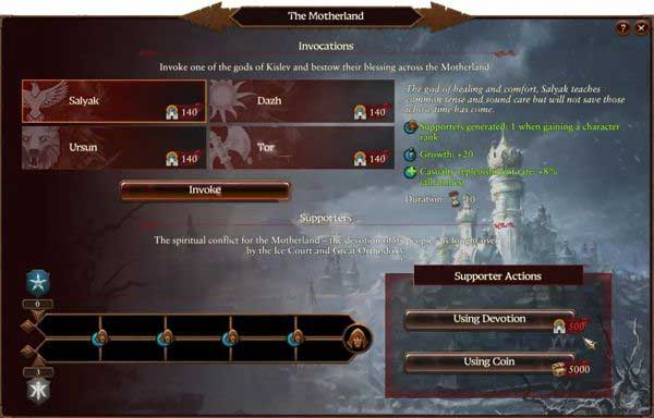 每一次对祖国母亲启用仪式也会导致寒冬席卷基斯里夫的土地,使得基斯里夫白雪遍地,这些白雪可以阻碍敌人的进攻。如果你有足够的虔信,那么你就可以随意切换或延长仪式效果。这些强力的风暴和仪式也会刺激民众,使他们支持你的派系。