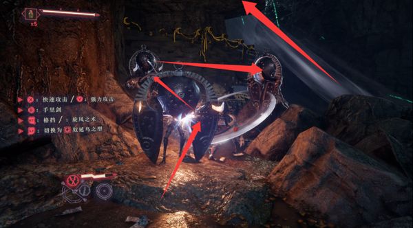 该boss还有一招,类似千手观音的连续锤击地面,可以用格挡加闪避的组合躲避。