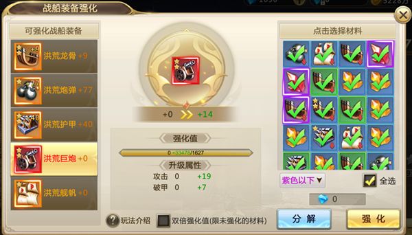 战船装备品质越高,星级越多,属性加成越多。战船装备可进行强化操作。