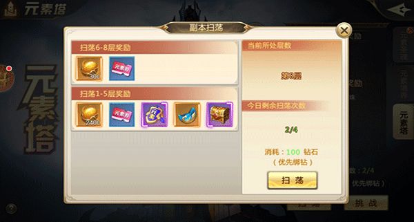 每天凌晨5点系统会系统刷新元素塔的扫荡,对了上边还有一点得加上,当每天挑战完毕元素塔时候技能扫荡,首次免费,扫荡会获得各种升级元素的道具和元素券,这个可以抽取提升元素的碎片,还有合成仙珠的碎片,仙珠唯一出处,合成仙珠必须过了10级元素塔,所以这里有难度!