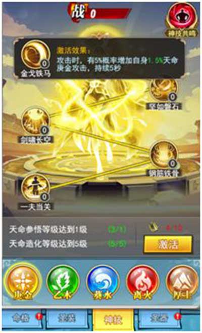 天命神技按照天命命格一一对应,每种命格下共有五个神技,激活神技需要天命参悟以及天命造化达到对应条件即可,激活后可按照神技条件继续升级;激活多个神技还可产生神技共鸣效果,可以给玩家提供角色属性提升,共鸣效果随着神技技能等级成长。