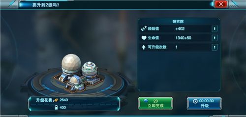点击可升级建筑,浮出升级按钮,点击升级按钮,弹出升级界面,如图2。在升级界面,如果建筑未到限制等级上限、资源足够、建筑队列有空闲,点击升级按钮后关闭升级界面,完成建筑升级操作。建筑升级和建造一样,同样会产生升级CD。