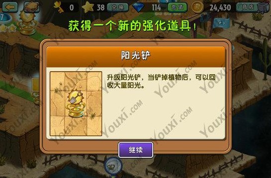 通关后,我们就能获得阳光铲:升级阳光铲,当铲掉植物后,可以回收大量阳光。