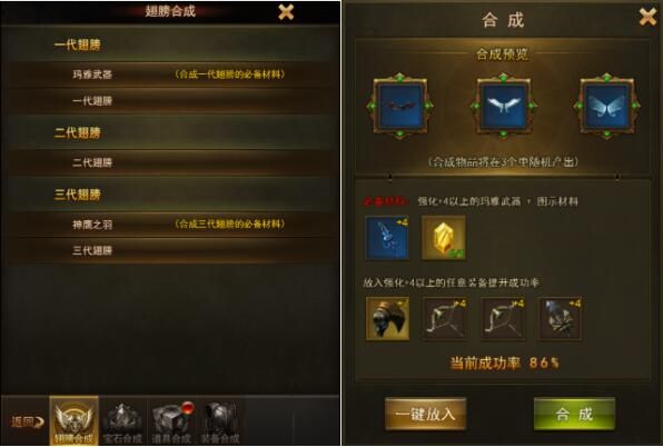 1、翅膀合成:翅膀合成分成翅膀合成以及翅膀合成材料的合成,阶段越高,需要的道具就越多,部分道具的合成有成功率,并不是百分百合成哟!