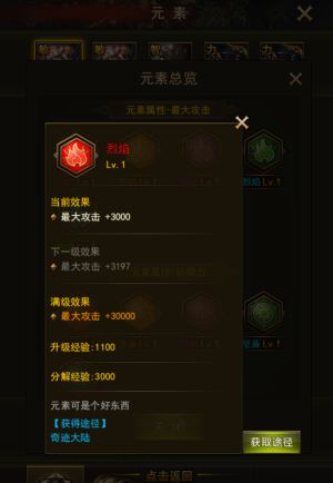 3、每一种元素一共有5个品质,其中蓝色元素属性最低,红色元素属性最高。其次,可以通过消耗元素经验提升元素等级,元素等级越高,属性也越强大。分解元素精华和元素可获得元素经验哦。