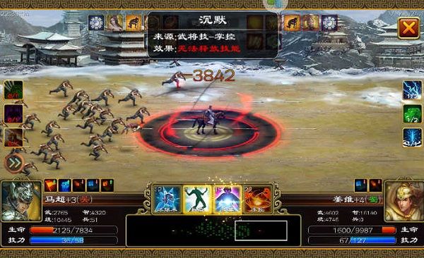 马超放大有三个效果出现,一是全防;二是禁锢,也就是双方不能动;三是沉默,双方都不能放技能。同时会有一队兵出现在战场中间。可是为什么是战场中间,为啥不是武将面前??这个技能最大特点大大提高马超的生存能力,至于战场中间增兵真是鸡肋。