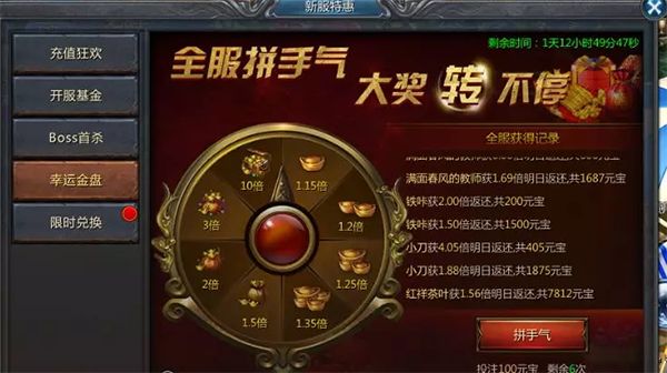 投入一定数量元宝。获得翻倍奖励。倍数就是抽中的倍。第二天邮件返还元宝。值得注意的是参与轮盘的元宝将不参与消费活动。也就是每周五的消费狂欢活动不再参