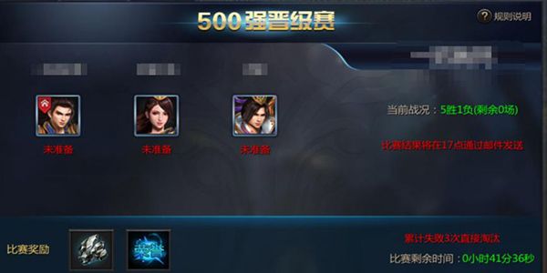 ①500强争夺赛:由报名的3000支战队进行互相匹配对战,每支战队获得6次对战机会,累计失败3场将会立即淘汰,比赛结束后胜利场次多的战队优先晋级,胜利场次相同时比赛积分高的战队优先晋级,胜场和积分均相同时战队三名队员总攻击力高的战队优先晋级,共取500支队伍,晋级结果在当天17点通过邮件通知。