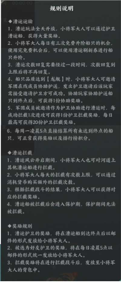 1、全天开放,可通过护卫漕运船(船只阶级越高,奖励越丰厚)获得大量奖励,也可对河道上的船只进行拦截,根据对应的战斗结果获得对应的拦截奖励。