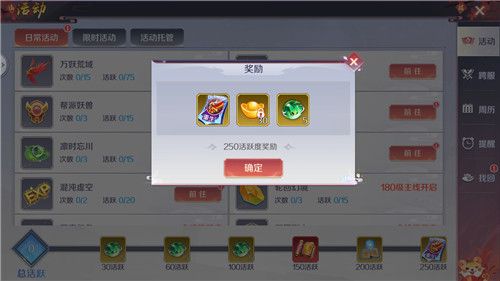 其次就是日常任务了,日常任务中我们一共可以获得120个免费的元宝,这些元宝需要通过活跃值来领取,当玩家的活跃值达到了30/60/100/150/200/250的时候都可以获得一定的元宝,这是平民玩家获取元宝的主要方法。