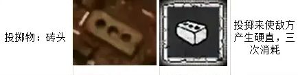 11、投掷物:砖头,投掷此道具来让敌方产生硬直,三次性消耗。