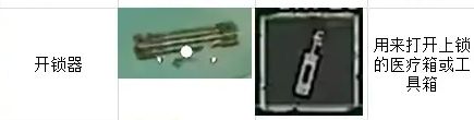 1、开锁 器,玩家能够用其来打开上锁的医疗箱或工具箱。