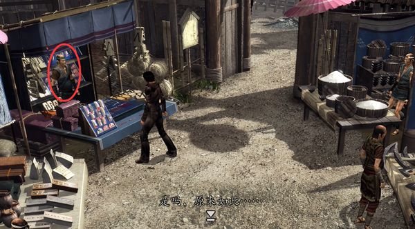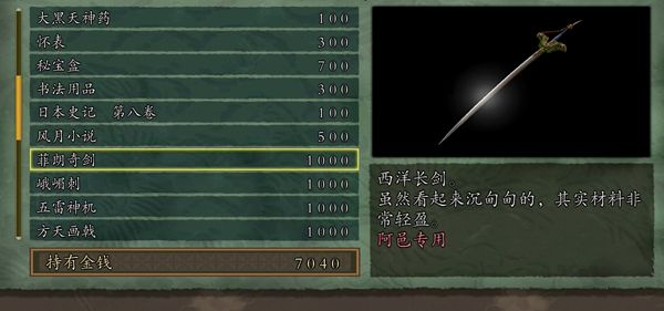 出门前,跟商店老板对话,购入菲朗奇剑、峨嵋刺、五雷神机、方天画戟、倾心药、不动护腿、怀表、风月小说和日本史记 第八卷。
