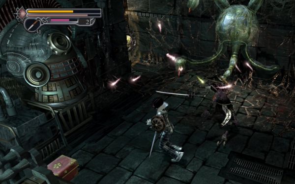 一直往前走,清怪,敌人还挺猛的,打完三波之后前面出现存档点,后面有个宝箱能开罗马战剑。