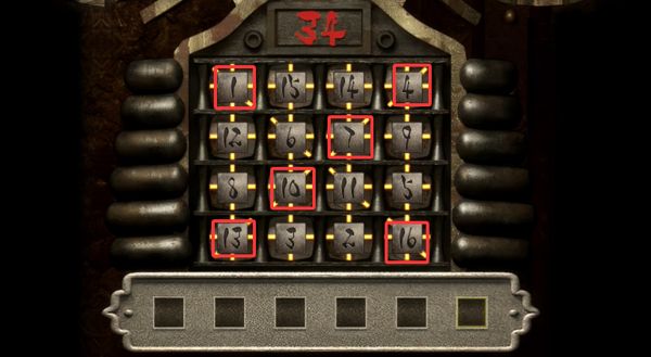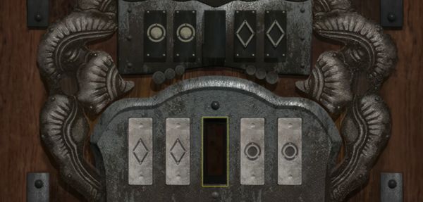 进去左手边是个雕像,触碰会看见一个密码机关,需要玩家调换下方的铁牌让顺序跟上方一样。