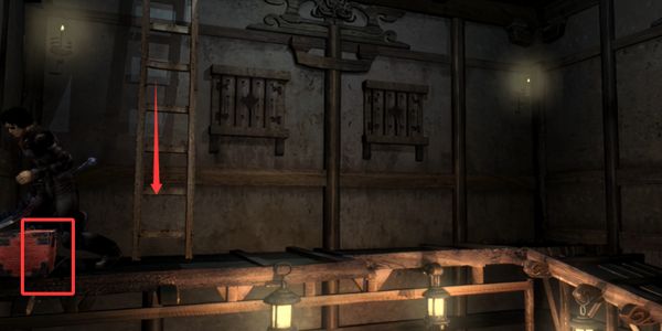 顺着宝箱旁边的梯子往上爬,顺着路走到尽头,爬下向下的梯子,进门里。