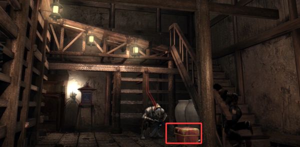 过来顺着楼道走,爬下楼梯,下来后左手边是个密码宝箱。