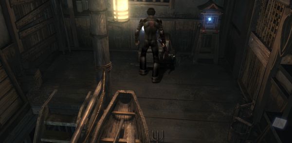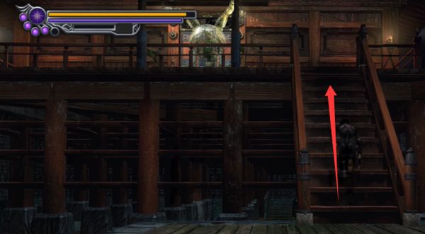 左边能吸鬼力,旁边有存档点能存档还能强化自己的装备,而后下楼梯上船。