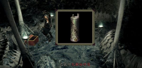 继续往里面走过几个有敌人的区域,将它们击败,然后到下图所示位置有宝箱能开,获得化解粉竹筒。