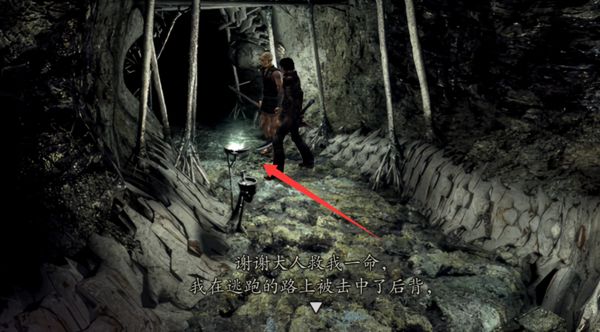 往前走用化解粉竹筒解救洞口石化的敌人,剧情对话结束后获得秘药,从旁边的通道进去。