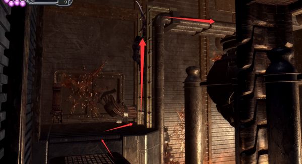 出门右边紫色闪光点是秘药,然后往前走,爬上梯子顺着水管走到下一个梯子,继续往上爬。