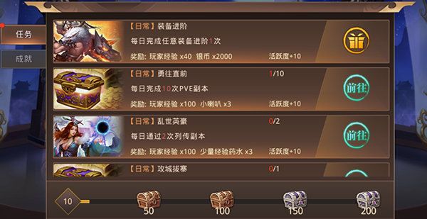 每日任务:是获取大量任务玩家经验的最佳途径,免费玩家在没有大量体力转换为经验的情况下,每日活动为玩家升级最佳途径。成就,则为玩家提供完成成就后的大量银币、元宝以及经验药剂等奖励。
