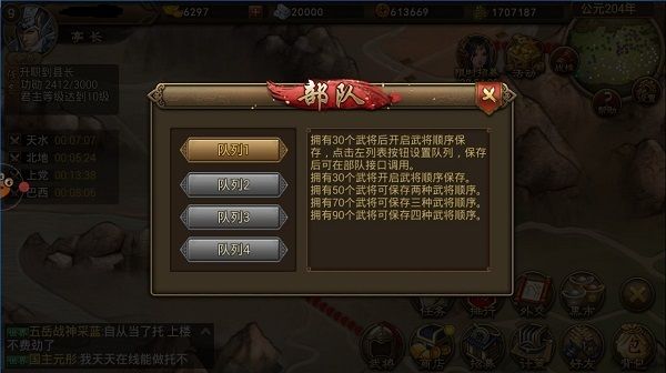 首先我们拥有30个武将以上就可以开启武将队列,在点击主界面武将后,点击武将队列可以进入武将的部队排列。