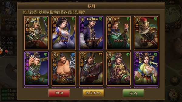 进入武将队列后,可以根据自己的爱好和武将技能组合来编排阵容,官位在县长之前都是最大限制6位武将出兵攻打敌国,组编好武将队列后,记得要保存好哦。