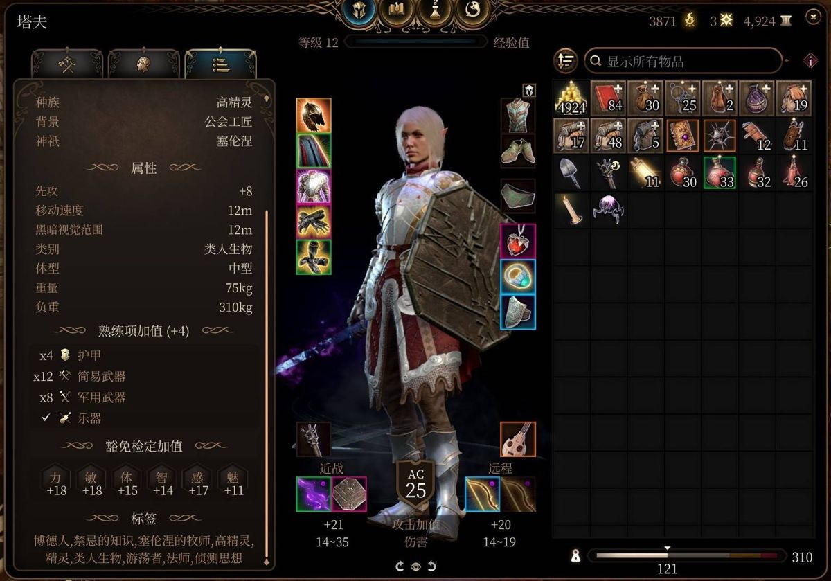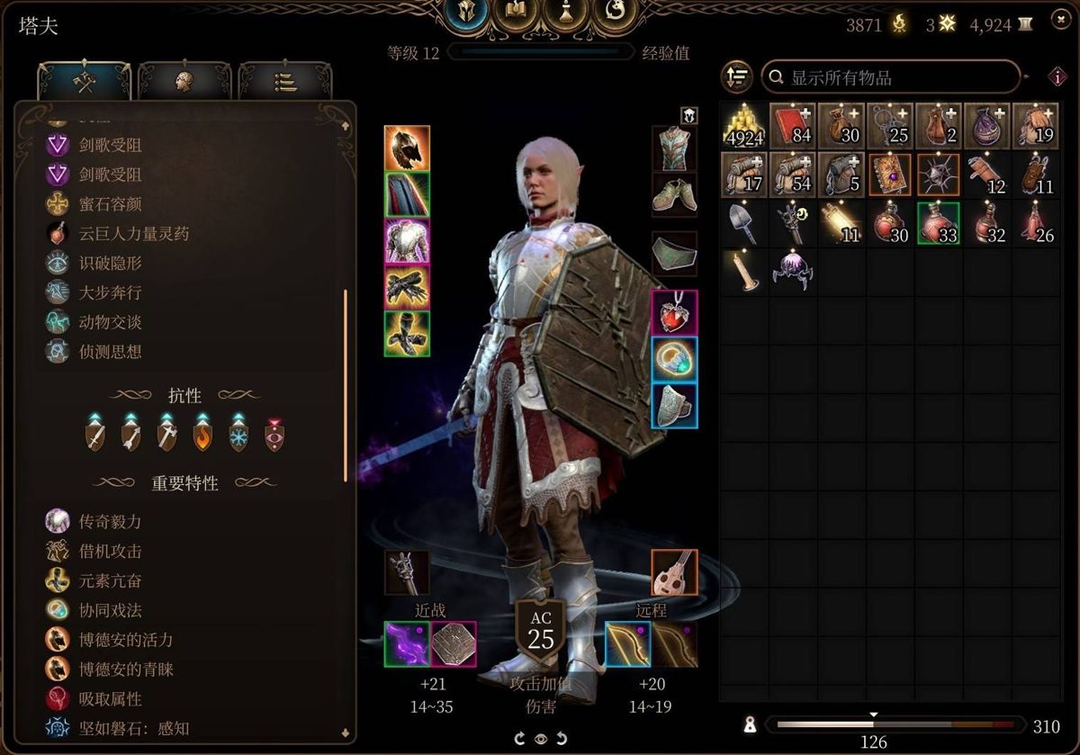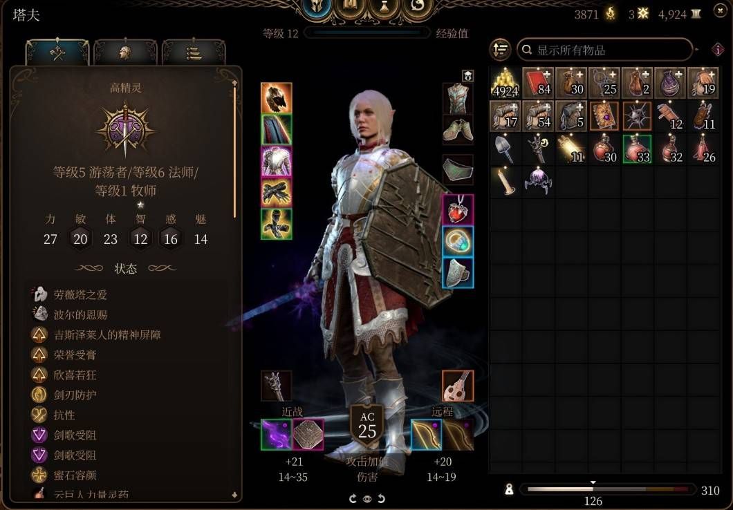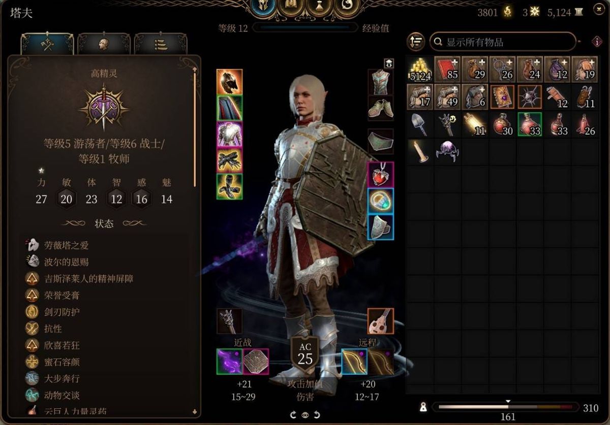 12级,5风流6剑咏1牧。拿二打,法表自由,大步奔行自由。剑咏开,拿感知、智力熟练,专长重甲大师、盾牌大师。8力,17敏(头皮+1),8体,16感知(镜子给感知),14智、12魅。装备一进下城区就都能拿到,坚毅甲、导力盾牌、黯狱头、力量手套、体质项链(感谢拉斐尔)。其他就黑火短弓,守护披风,协同戒指,坚毅鞋。戒指可以戴抗毒戒指,这样常驻三种抗性,鞋和戒指都可以根据需要更换。武器就心灵刀,遇见免疫的,可以换奥林匕首,或者精金弯刀、训练剑灵药可以选择英勇灵药,加豁免、命中,也是根据需要更换。