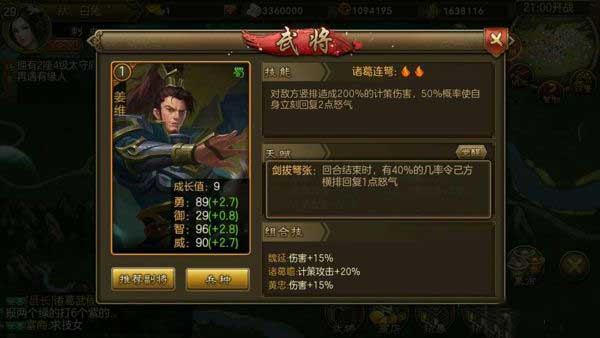 ②、 姜维 两怒将技能对敌方竖排造成200%的计策伤害,50%概率使自身立刻回复两点怒气。兵种推荐斥候普攻无视闪避,天赋觉醒回合结束时,有40%几率恢复乙方横排一点怒气。