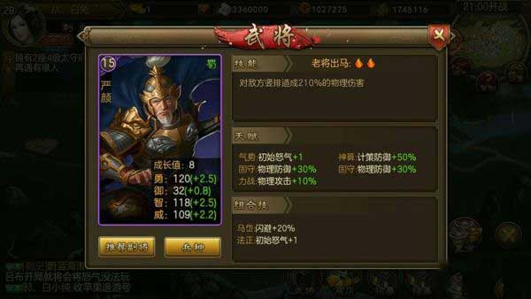 ④、 严颜 两怒将技能对敌方竖排造成210%物理伤害,兵种推荐斥候普攻无视闪避