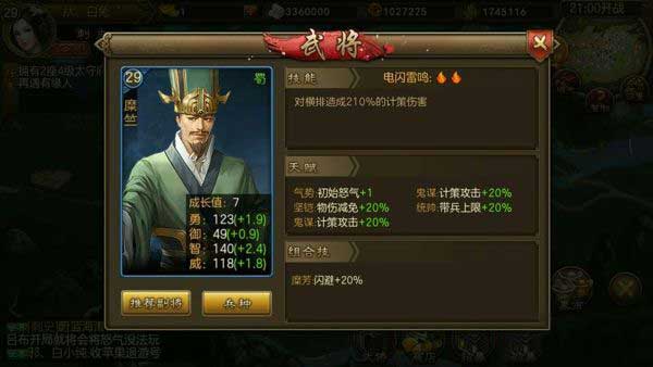 ③.、 法正 三怒将技能对敌方全体造成120%的计策伤害,兵种推荐强弓兵计策伤害增加25%