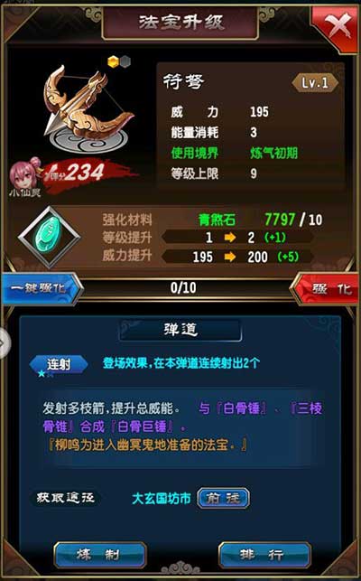 升级和炼制方法:打开行囊-选择需要炼制的法宝