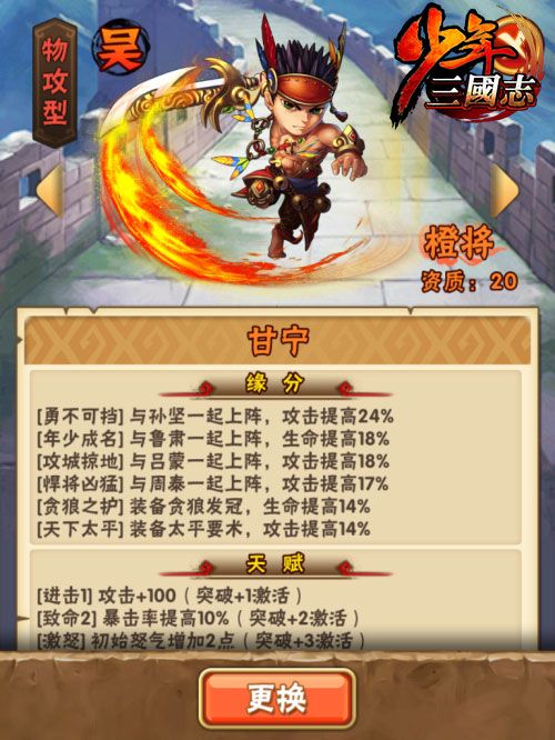 以橙将甘宁为例,我们可以搭配出一套非常具有进攻性的吴国阵容。