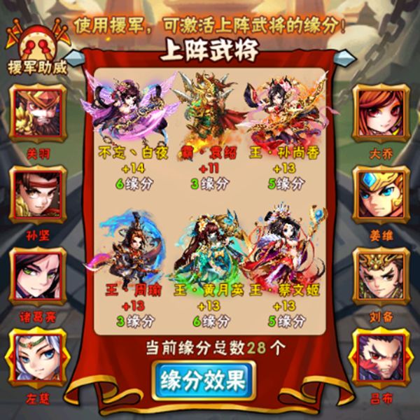 个人比较懒,PVP PVE都用一套阵容了,平时打吴国的叛军,黄月英满缘分,孙尚香蔡文姬满攻击缘分,打架副核月英,打叛军副核香香,直接双将换位置,比较方便。