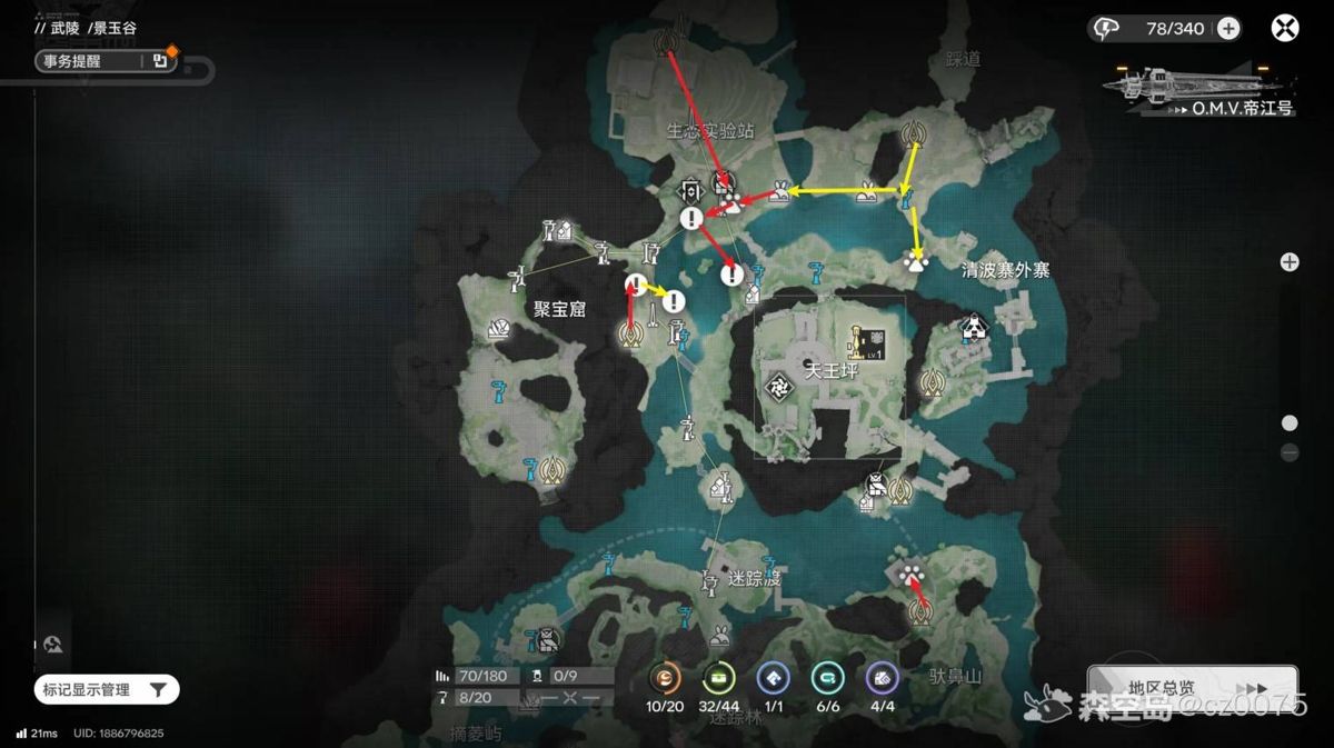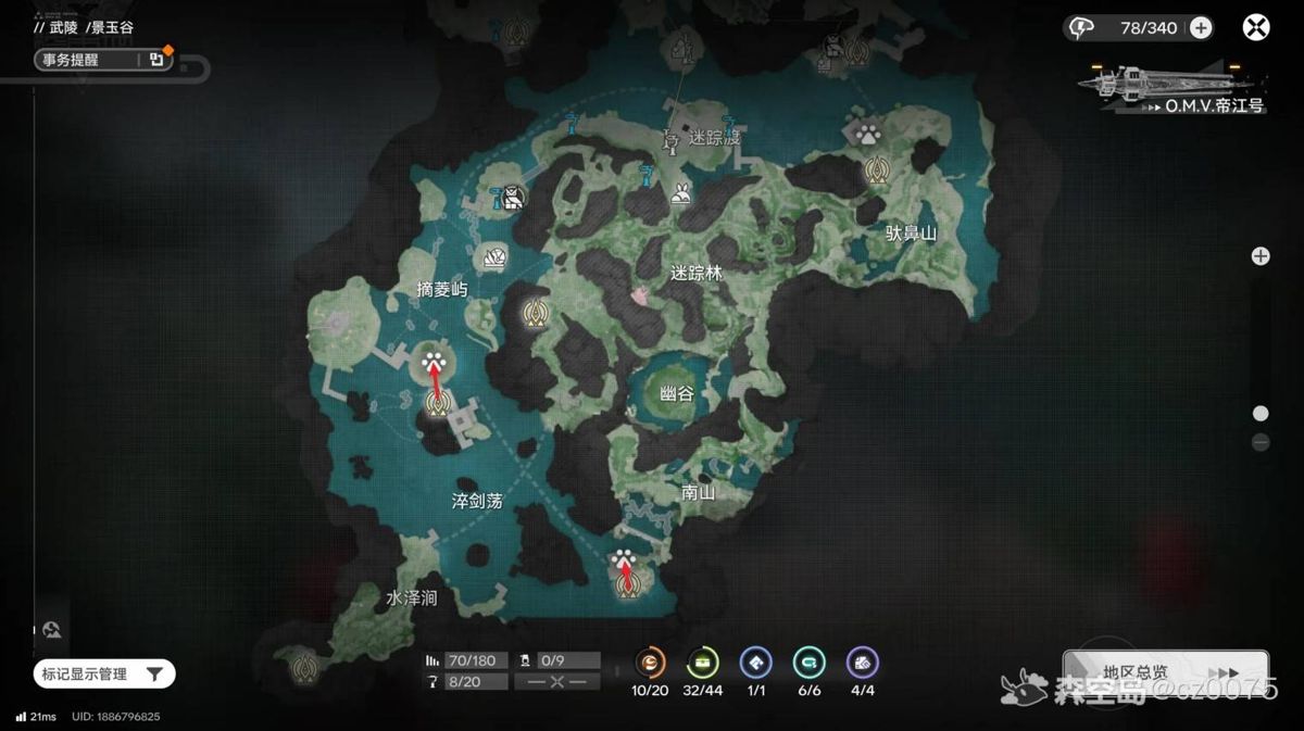 叹号为灼壳虫,脚印为水灯虫/虫肉,标签为新笋。