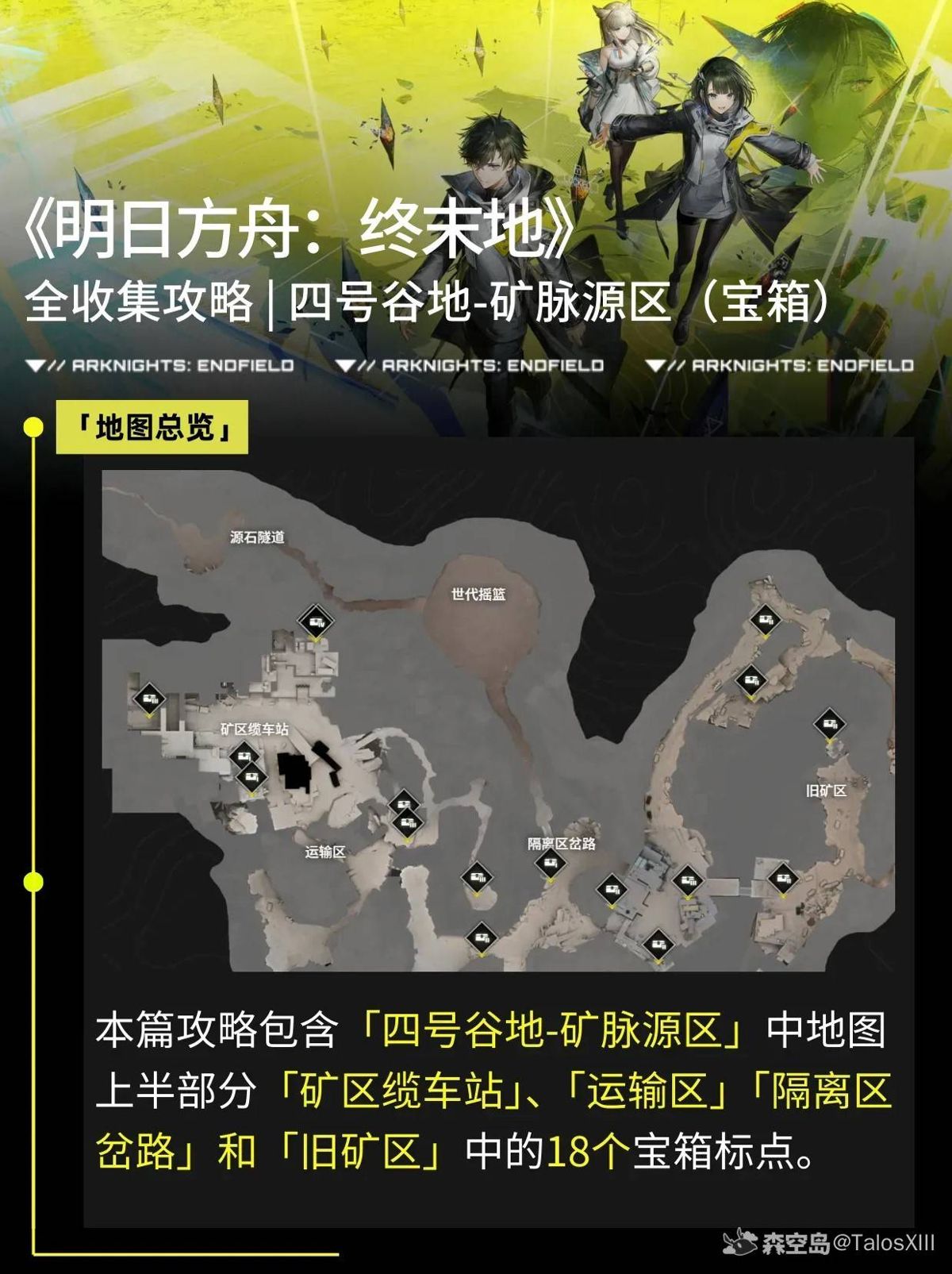 明日方舟终末地中矿脉源区的宝箱都在哪里呢?有着这个问题的玩家请看下方由“TalosXIII”为大家带来的明日方舟终末地矿脉源区宝箱位置一览,希望能够帮助到大家。