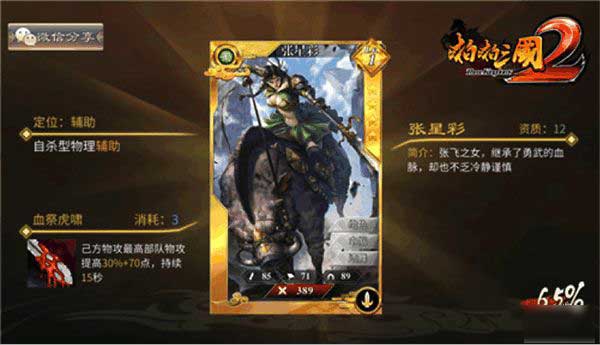 张星彩,张飞之女,继承了勇武的血脉,却也不乏冷静谨慎。在啪啪三国2中,张星彩的定位是自 杀型物理辅助,大招“血祭虎啸”可提高己方物攻最高部队的物理攻击,随着自身生命值的减少可提升小幅物攻。