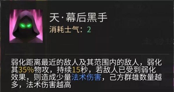 强化距离最近的敌人及其范围内的敌人,弱化其35%物攻,持续15秒,若敌人已受到弱化效果,则造成少量法术伤害,己方群雄数量越多,法术伤害越高