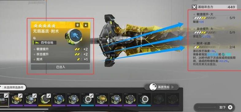 示例:一把物理输出型武器,其毕业基质可能包含【攻击提升·大】、【敏捷提升·大】和【附术·祝源】(或同类增伤词条)。