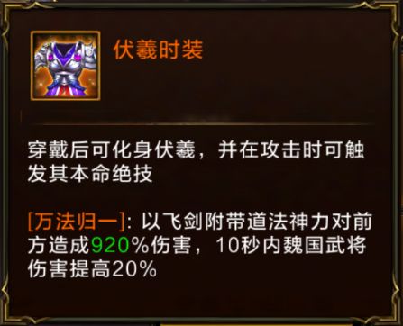 对于时装的选择,大部分时装只能够为本国的武将提供效果,那么我们可以选择伏羲的时装和夏侯惇时装。当然了我们也可以选择张角时装,因为目前的版本中只有夏侯惇和张角的时装是不受国家限制的,并且都能够提高我们的输出量。所以具体如何选择,魏国的朋友们可以根据自己的情况来从上述三件时装中进行选择。