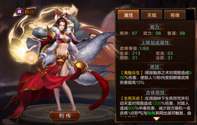 张角本身就有着很强的伤害,而他与妲己的合击不仅可以造成大量伤害还可以随机减少敌方一名武将1点怒气并且使敌方进入中毒状态。而妲己本身的技能也能够使敌人10秒内受到群雄武将的伤害提高15%,可以说是让敌人雪上加霜,所以这对组合是必不可少的~