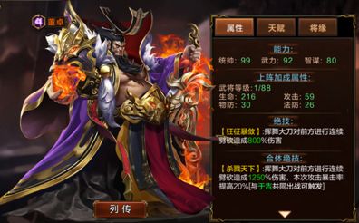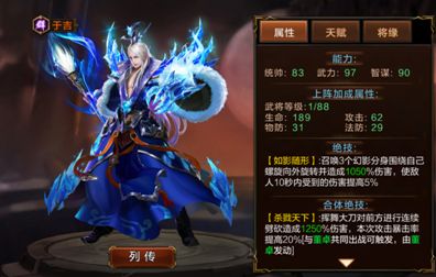 于吉与董卓的合体技能够使当次的攻击暴击率提高20%,而于吉本身的技能也能够使敌人10秒内受到群雄武将的伤害提高5%,伤害量也是非常可观的。