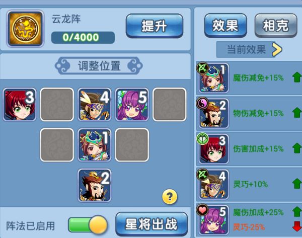术 士:多数使用云龙阵让法术伤害爆表,雁行阵灵巧加成先声夺人。