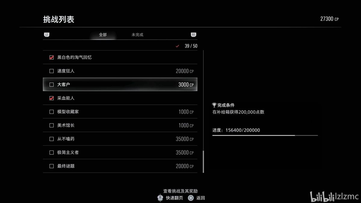 原本是先完成最终谜题拿到2万cp点数,再加上完成大客户里昂补给箱刷20万点数,就可以在二周目使用无限弹药(枪 械)来速通4小时+不吃药+不用采血器。一周目通关时,大客户大概有15万6千左右,如果前面刷了那应该完成了。
