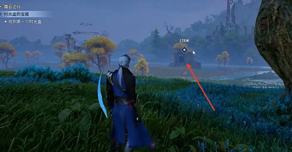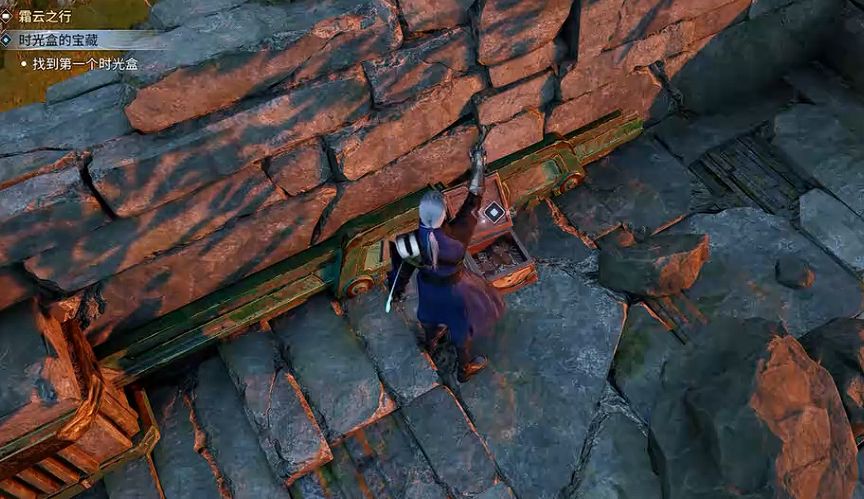 寻找第一个时光盒,从触发点向东南方向探秘点上方建筑攀爬,清理怪物后拾取时光盒。